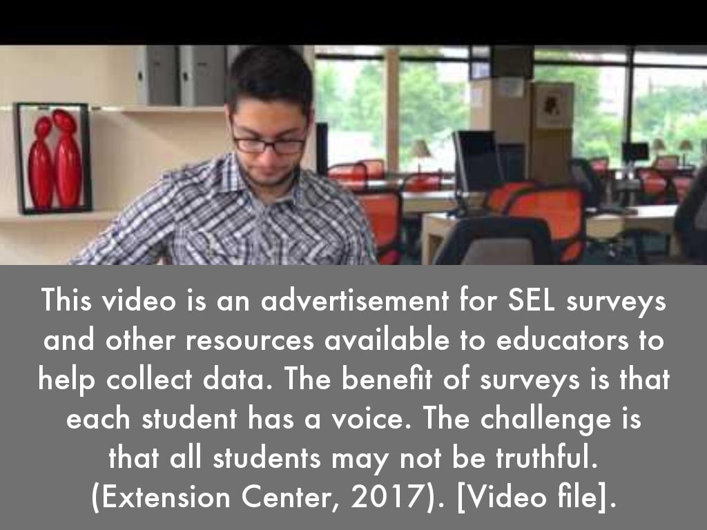 This video is an advertisement for SEL surveys and other resources available to educators to help collect data. The benefit of surveys is that each student has a voice. The challenge is that all students may not be truthful. (Extension Center, 2017). [Video file].