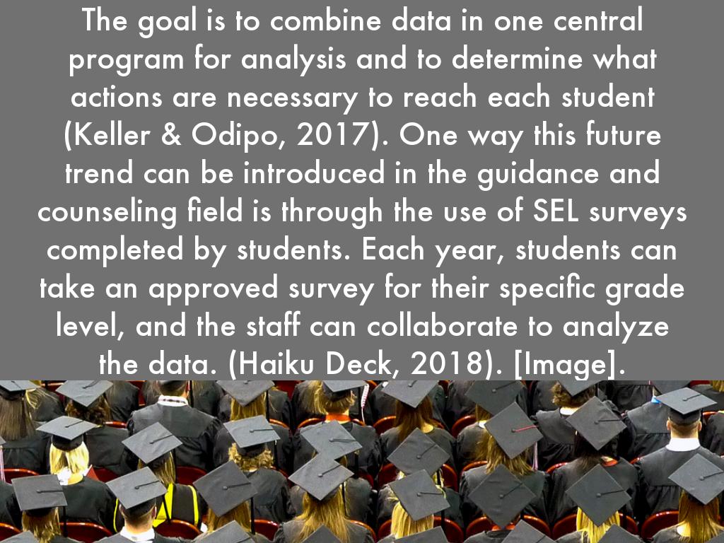 The goal is to combine data in one central program for analysis and to determine what actions are necessary to reach each student (Keller & Odipo, 2017). One way this future trend can be introduced in the guidance and counseling field is through the use of SEL surveys completed by students. Each year, students can take an approved survey for their specific grade level, and the staff can collaborate to analyze the data. (Haiku Deck, 2018). [Image].