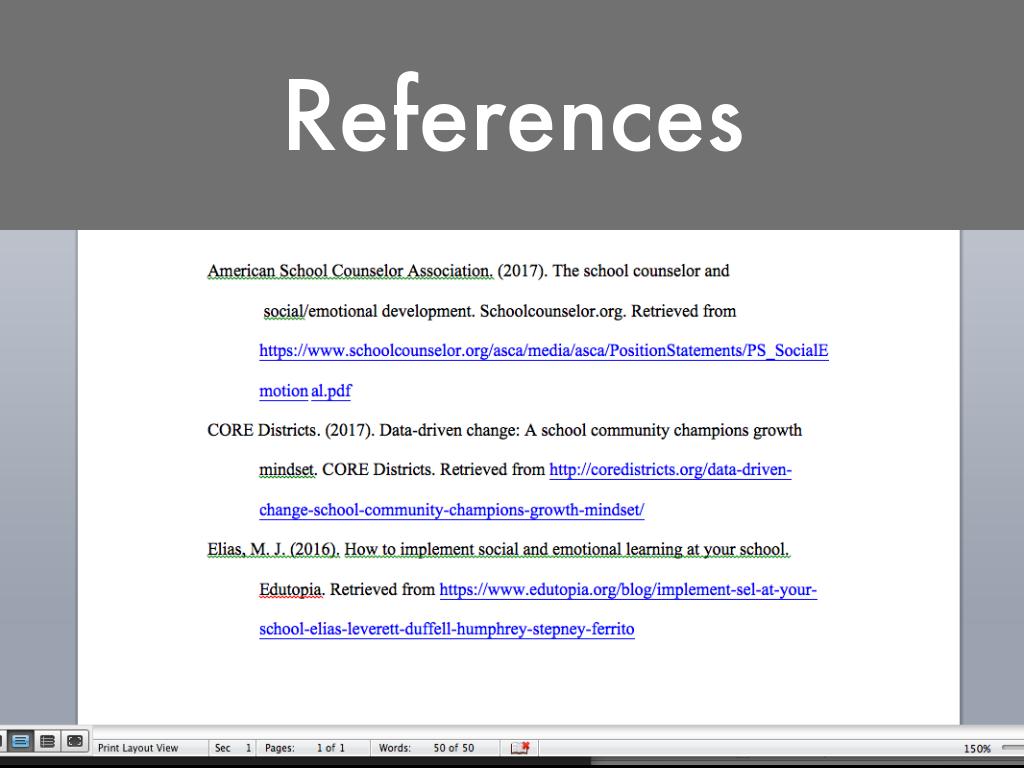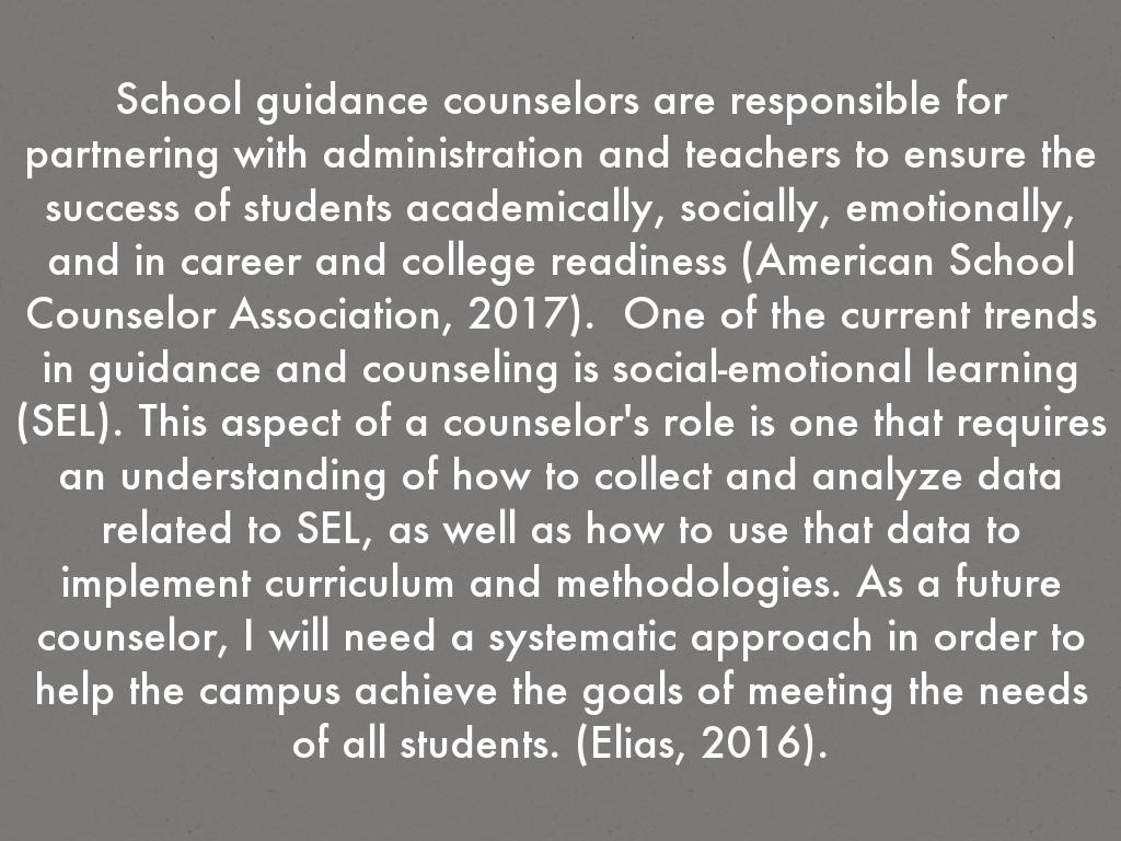 School guidance counselors are responsible for partnering with administration and teachers to ensure the success of students academically, socially, emotionally, and in career and college readiness (American School Counselor Association, 2017). One of the current trends in guidance and counseling is social-emotional learning (SEL). This aspect of a counselor's role is one that requires an understanding of how to collect and analyze data related to SEL, as well as how to use that data to implement curriculum and methodologies. As a future counselor, I will need a systematic approach in order to help the campus achieve the goals of meeting the needs of all students. (Elias, 2016).