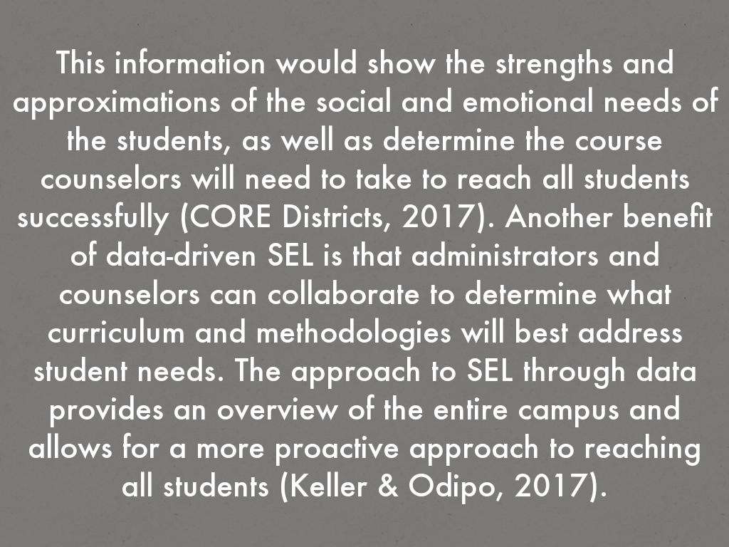 This information would show the strengths and approximations of the social and emotional needs of the students, as well as determine the course counselors will need to take to reach all students successfully (CORE Districts, 2017). Another benefit of data-driven SEL is that administrators and counselors can collaborate to determine what curriculum and methodologies will best address student needs. The approach to SEL through data provides an overview of the entire campus and allows for a more proactive approach to reaching all students (Keller & Odipo, 2017).