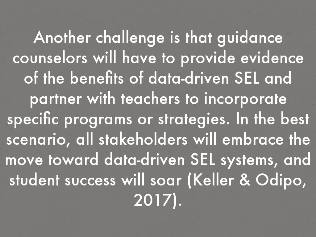 Another challenge is that guidance counselors will have to provide evidence of the benefits of data-driven SEL and partner with teachers to incorporate specific programs or strategies. In the best scenario, all stakeholders will embrace the move toward data-driven SEL systems, and student success will soar (Keller & Odipo, 2017).