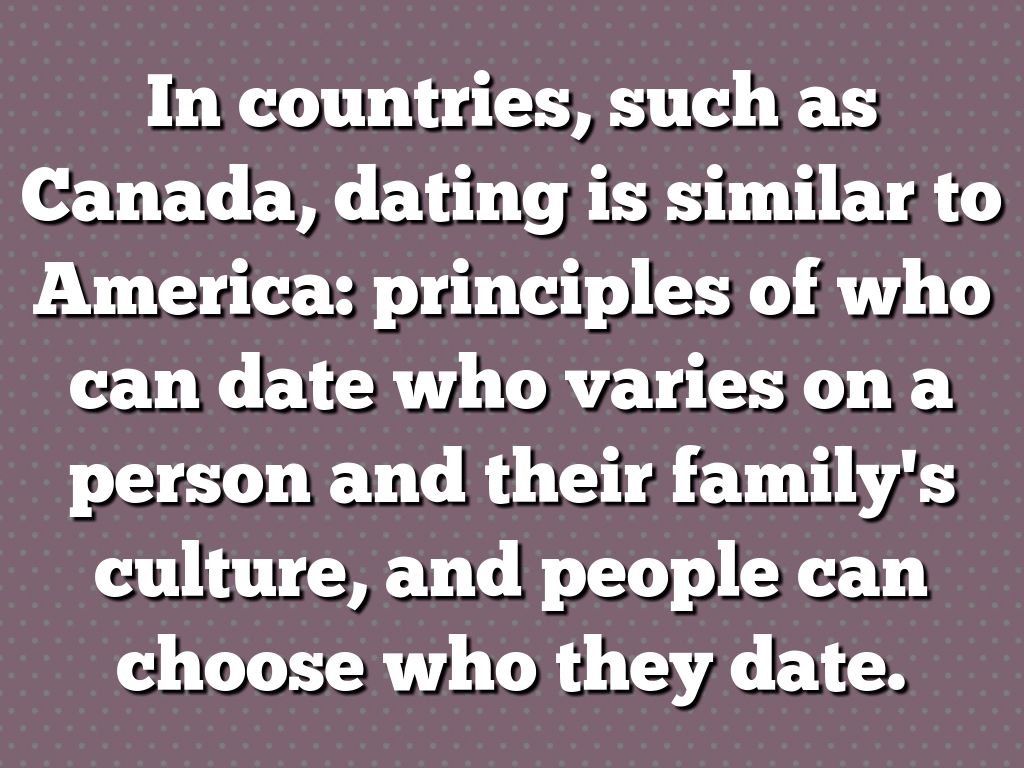 In countries, such as Canada, dating is similar to America: principles of who can date who varies on a person and their family's culture, and people can choose who they date.