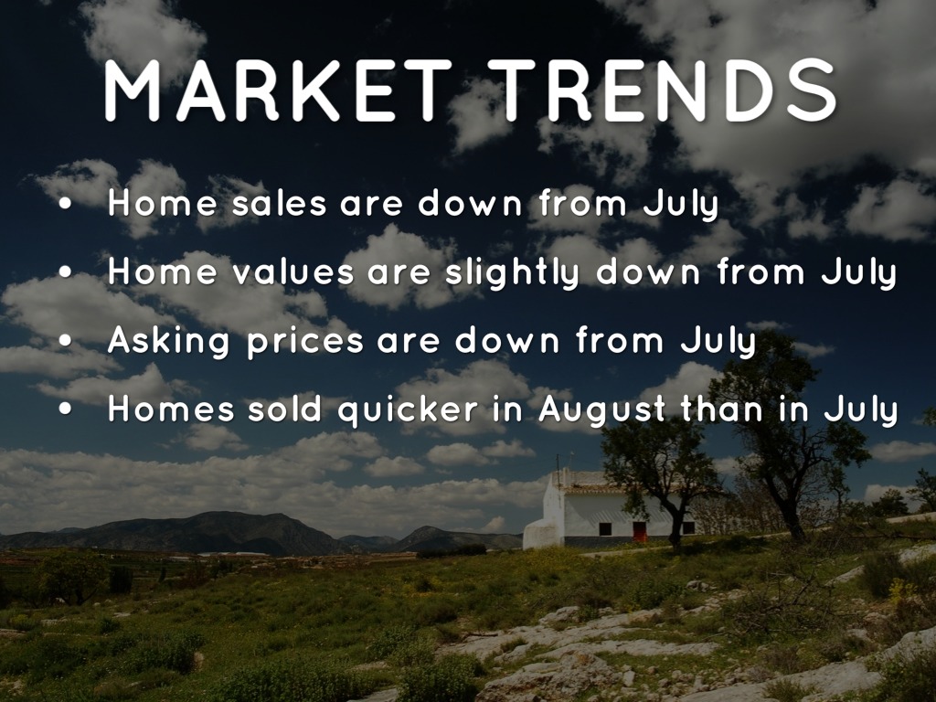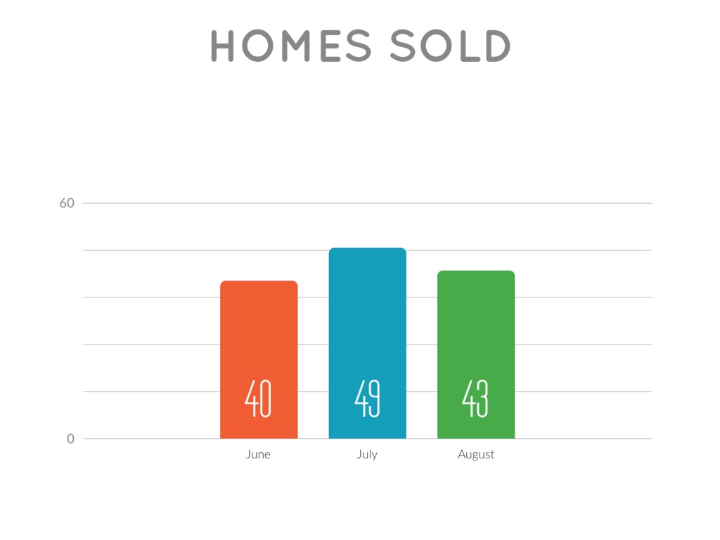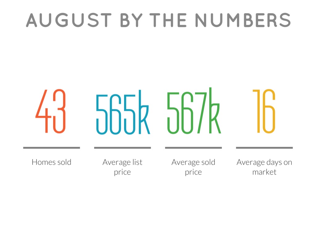 Fewer homes sold in August than compared to July. Both sold prices and listing prices are slightly down from July's highs. However, the pace of home sales was up in August.