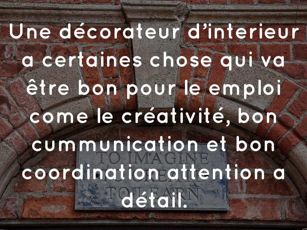 Une décorateur d’interieur a certaines chose qui va être bon pour le emploi come le créativité, bon cummunication et bon coordination attention a détail.