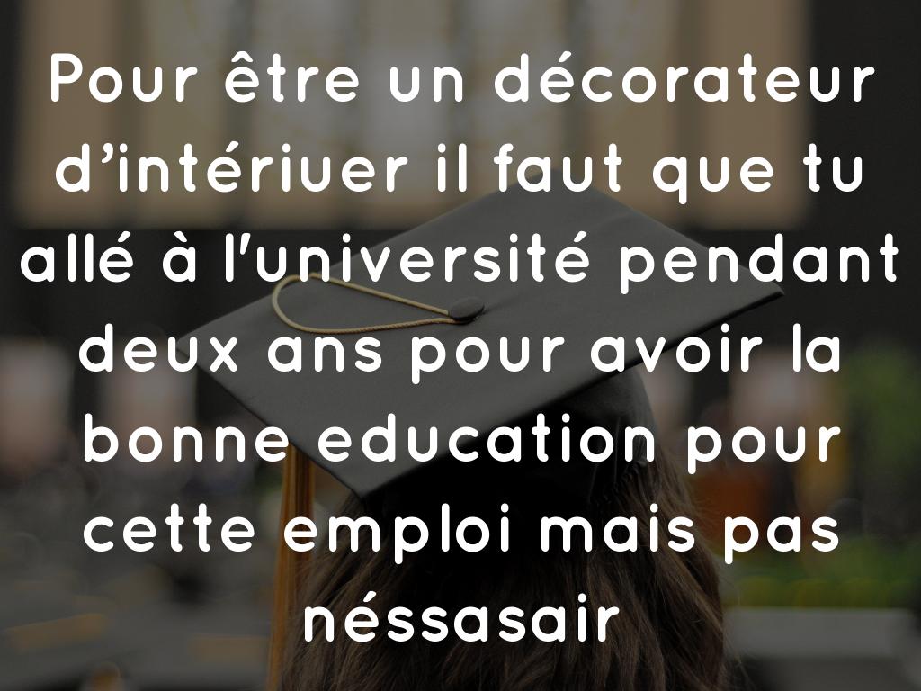 Pour être un décorateur d’intériuer il faut que tu allé à l'université pendant deux ans pour avoir la bonne education pour cette emploi mais pas néssasair
