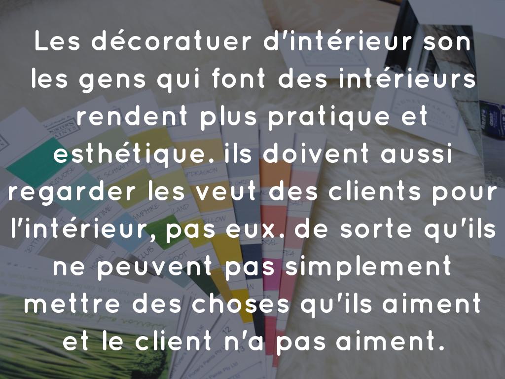 Les décoratuer d'intérieur son les gens qui font des intérieurs rendent plus pratique et esthétique. ils doivent aussi regarder les veut des clients pour l'intérieur, pas eux. de sorte qu'ils ne peuvent pas simplement mettre des choses qu'ils aiment et le client n'a pas aiment.