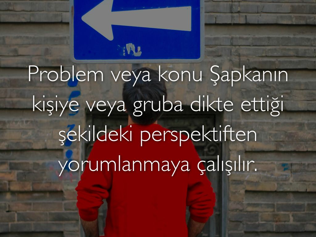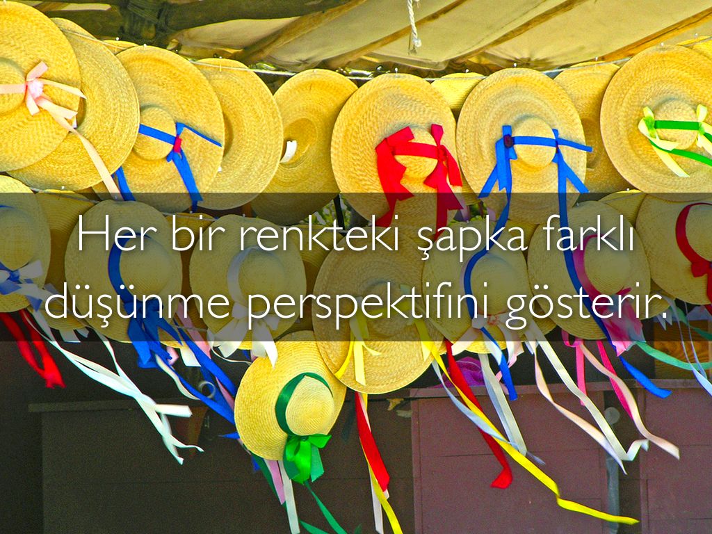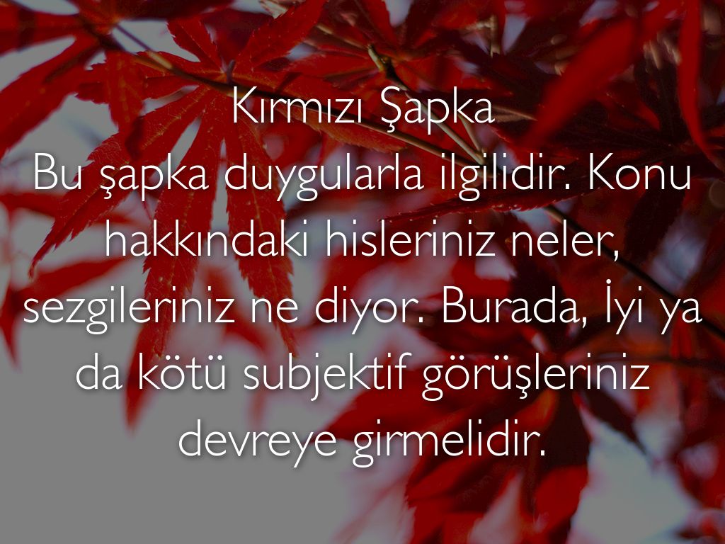 Kırmızı Şapka Bu şapka duygularla ilgilidir. Konu hakkındaki hisleriniz neler, sezgileriniz ne diyor. Burada, İyi ya da kötü subjektif görüşleriniz devreye girmelidir.