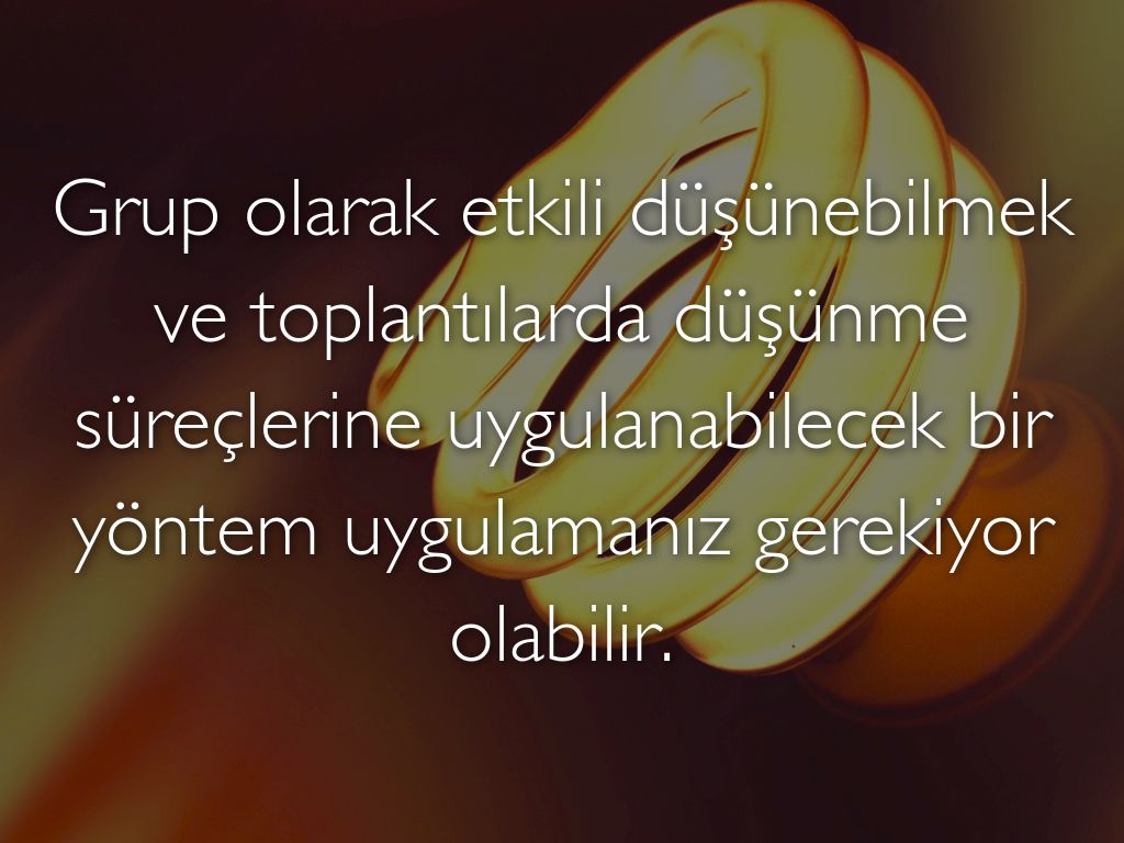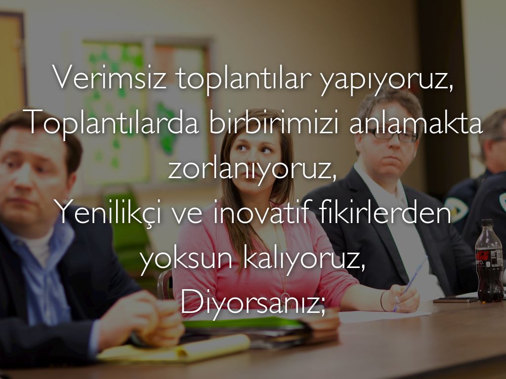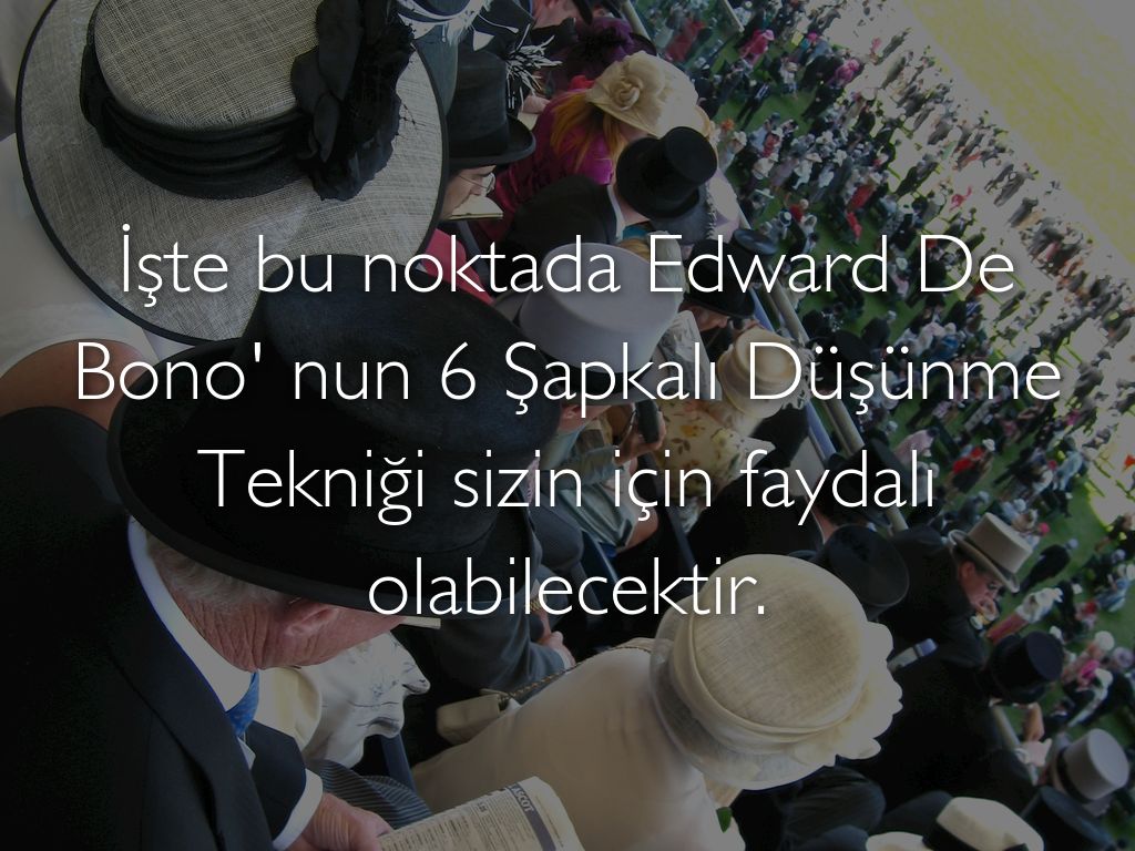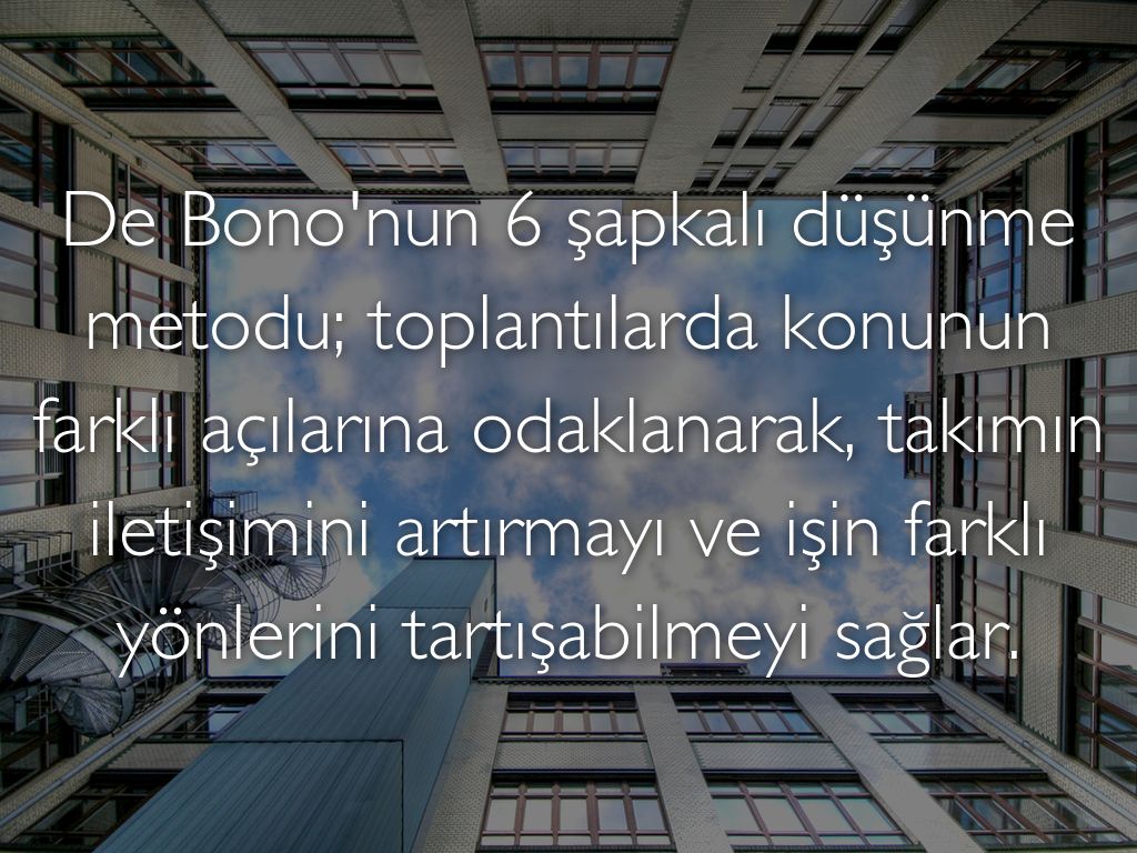 De Bono'nun 6 şapkalı düşünme metodu; toplantılarda konunun farklı açılarına odaklanarak, takımın iletişimini artırmayı ve işin farklı yönlerini tartışabilmeyi sağlar.