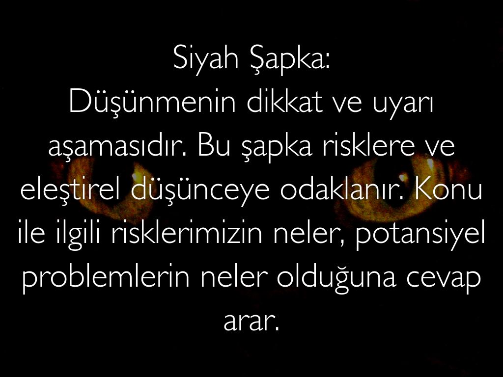 Siyah Şapka: Düşünmenin dikkat ve uyarı aşamasıdır. Bu şapka risklere ve eleştirel düşünceye odaklanır. Konu ile ilgili risklerimizin neler, potansiyel problemlerin neler olduğuna cevap arar.