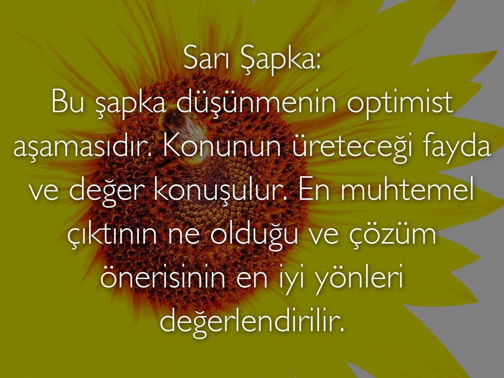Sarı Şapka: Bu şapka düşünmenin optimist aşamasıdır. Konunun üreteceği fayda ve değer konuşulur. En muhtemel çıktının ne olduğu ve çözüm önerisinin en iyi yönleri değerlendirilir.