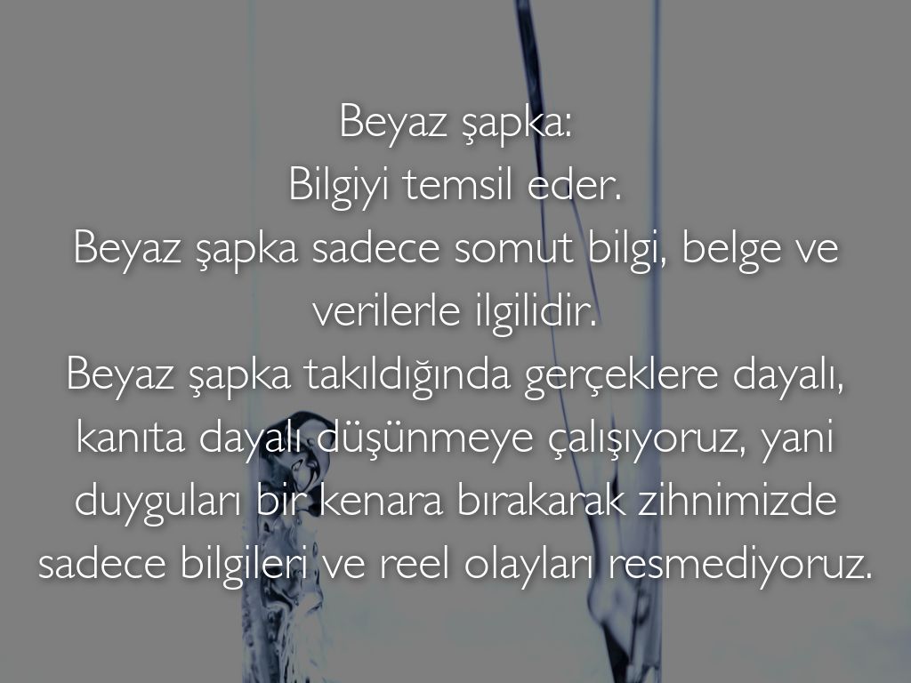 Beyaz şapka: Bilgiyi temsil eder. Beyaz şapka sadece somut bilgi, belge ve verilerle ilgilidir. Beyaz şapka takıldığında gerçeklere dayalı, kanıta dayalı düşünmeye çalışıyoruz, yani duyguları bir kenara bırakarak zihnimizde sadece bilgileri ve reel olayları resmediyoruz.