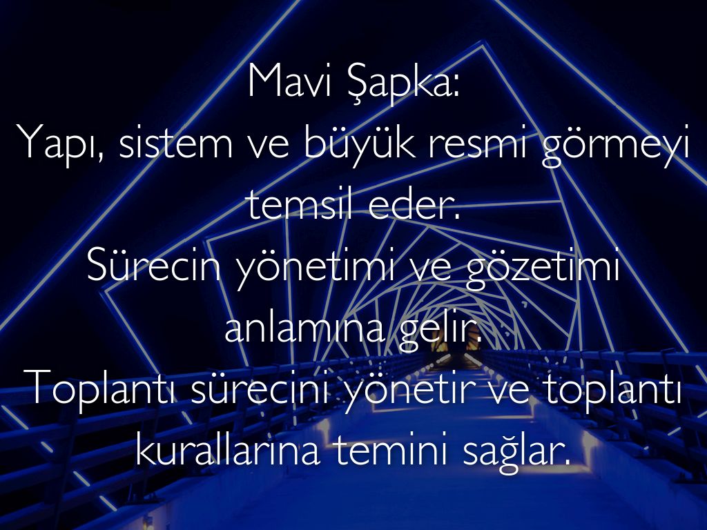 Mavi Şapka: Yapı, sistem ve büyük resmi görmeyi temsil eder. Sürecin yönetimi ve gözetimi anlamına gelir. Toplantı sürecini yönetir ve toplantı kurallarına temini sağlar.