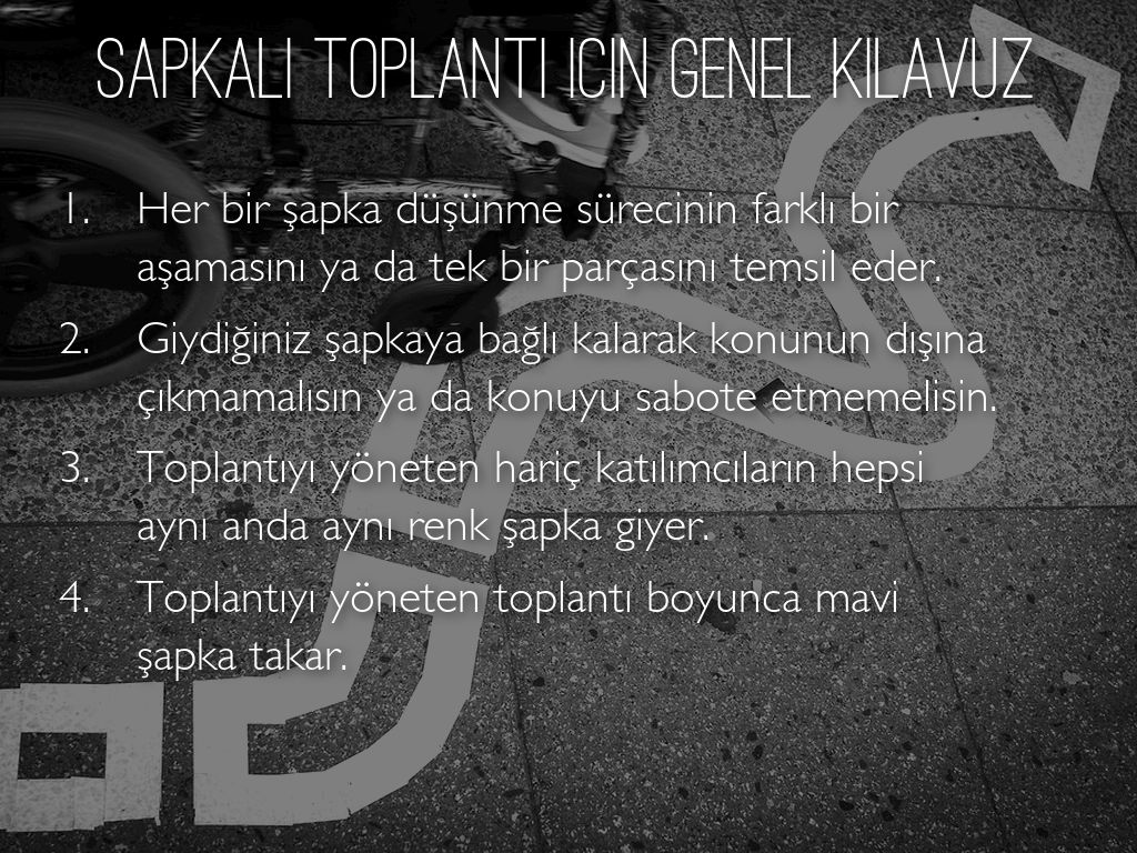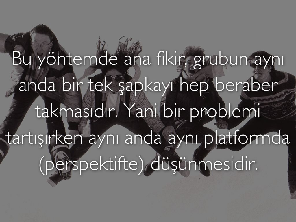Bu yöntemde ana fikir, grubun aynı anda bir tek şapkayı hep beraber takmasıdır. Yani bir problemi tartışırken aynı anda aynı platformda (perspektifte) düşünmesidir.