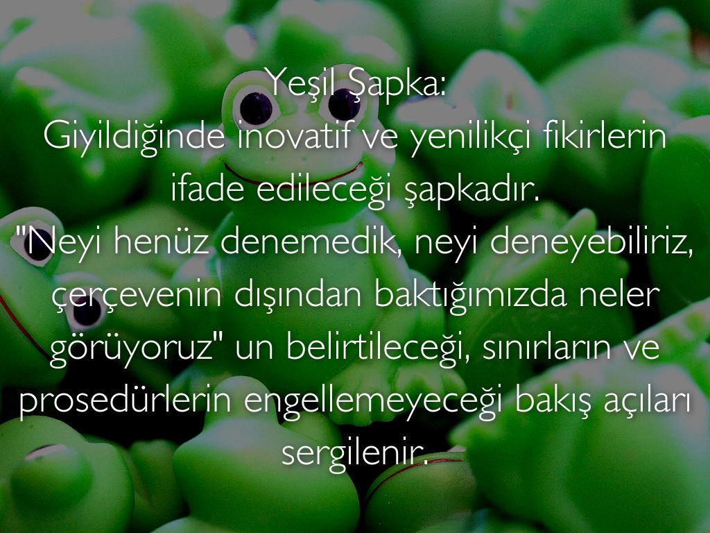 Yeşil Şapka: Giyildiğinde inovatif ve yenilikçi fikirlerin ifade edileceği şapkadır. "Neyi henüz denemedik, neyi deneyebiliriz, çerçevenin dışından baktığımızda neler görüyoruz" un belirtileceği, sınırların ve prosedürlerin engellemeyeceği bakış açıları sergilenir.