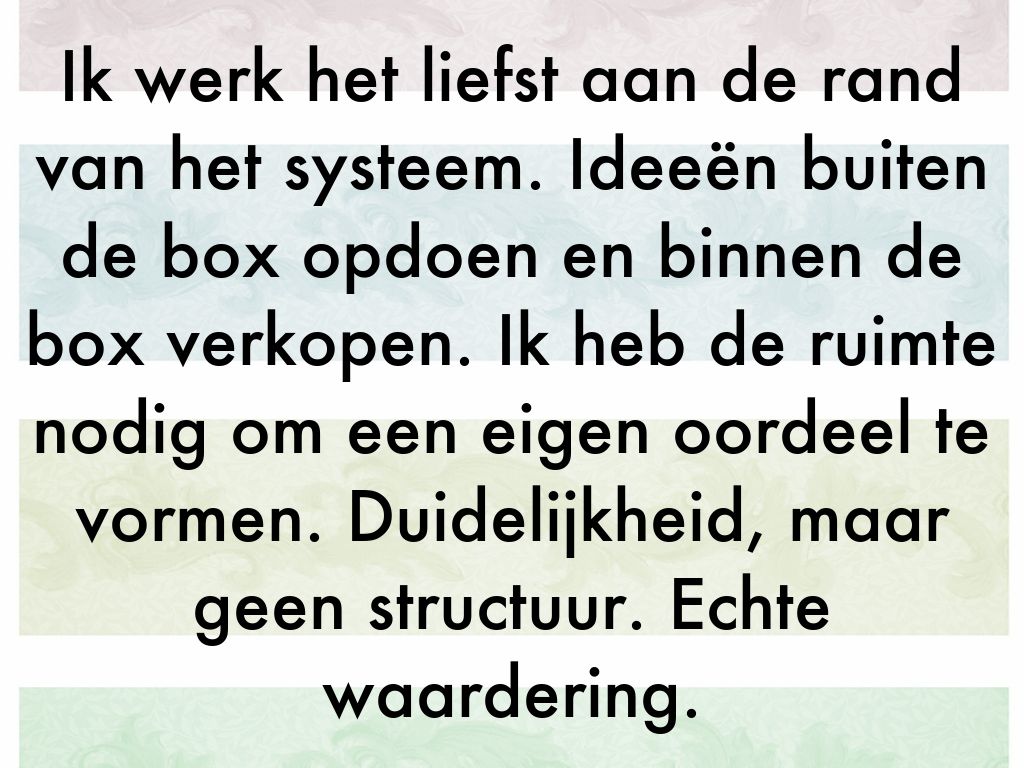 Ik werk het liefst aan de rand van het systeem. Ideeën buiten de box opdoen en binnen de box verkopen. Ik heb de ruimte nodig om een eigen oordeel te vormen. Duidelijkheid, maar geen structuur. Echte waardering.