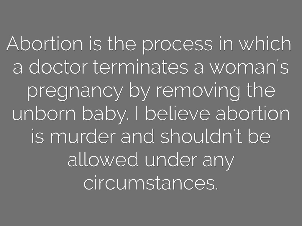 Abortion is the process in which a doctor terminates a woman's pregnancy by removing the unborn baby. I believe abortion is murder and shouldn't be allowed under any circumstances.