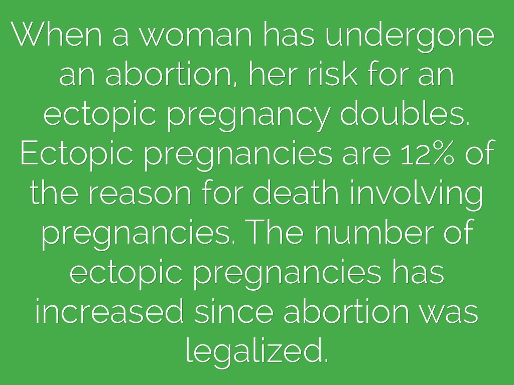 When a woman has undergone an abortion, her risk for an ectopic pregnancy doubles. Ectopic pregnancies are 12% of the reason for death involving pregnancies. The number of ectopic pregnancies has increased since abortion was legalized.