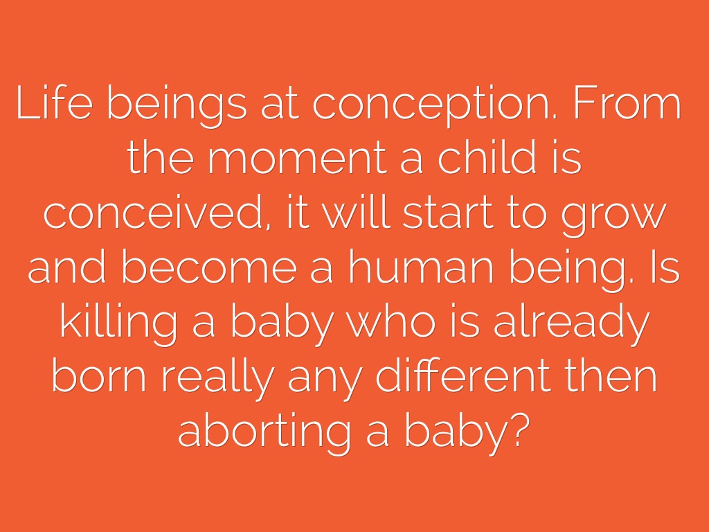 Life beings at conception. From the moment a child is conceived, it will start to grow and become a human being. Is killing a baby who is already born really any different then aborting a baby?