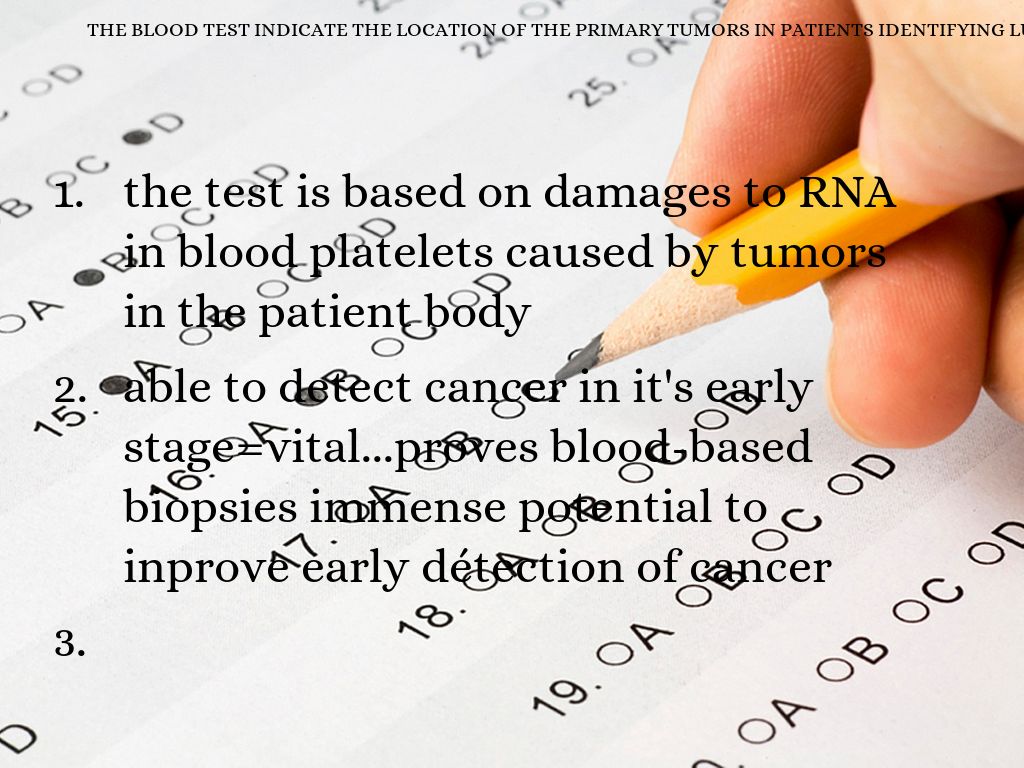 the test is based on damages to RNA in blood platelets caused by tumors in the patient body