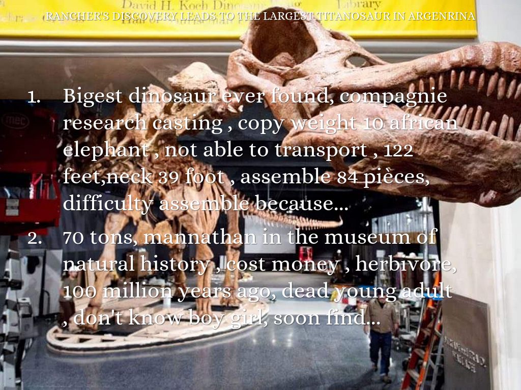 Bigest dinosaur ever found, compagnie research casting , copy weight 10 african elephant , not able to transport , 122 feet,neck 39 foot , assemble 84 pièces, difficulty assemble because...