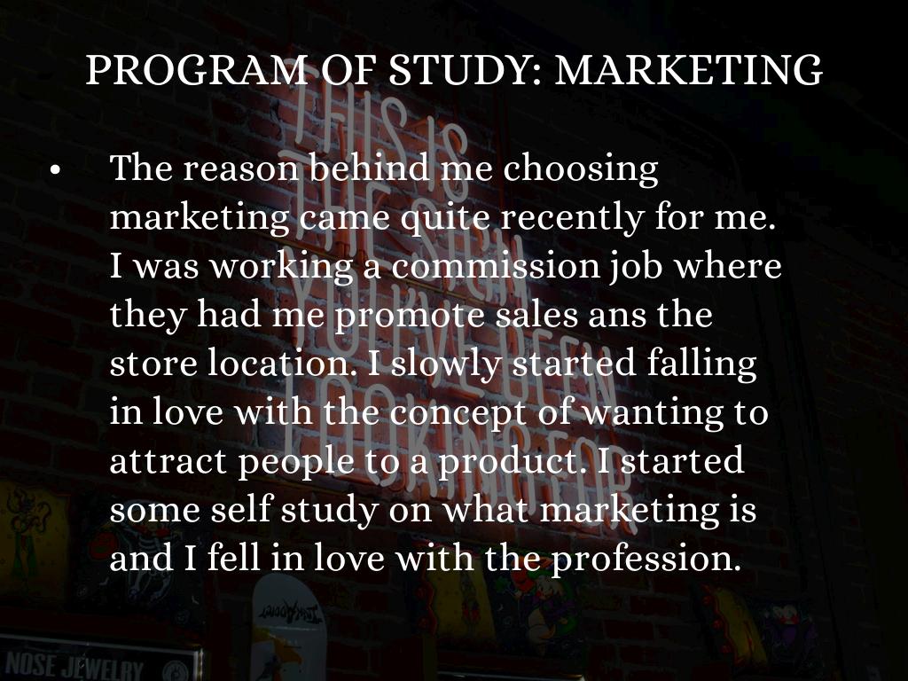 The reason behind me choosing marketing came quite recently for me. I was working a commission job where they had me promote sales ans the store location. I slowly started falling in love with the concept of wanting to attract people to a product. I started some self study on what marketing is and I fell in love with the profession.