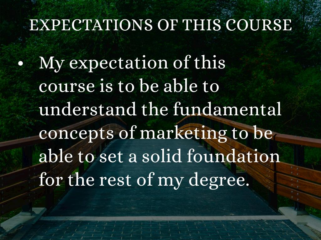 My expectation of this course is to be able to understand the fundamental concepts of marketing to be able to set a solid foundation for the rest of my degree.