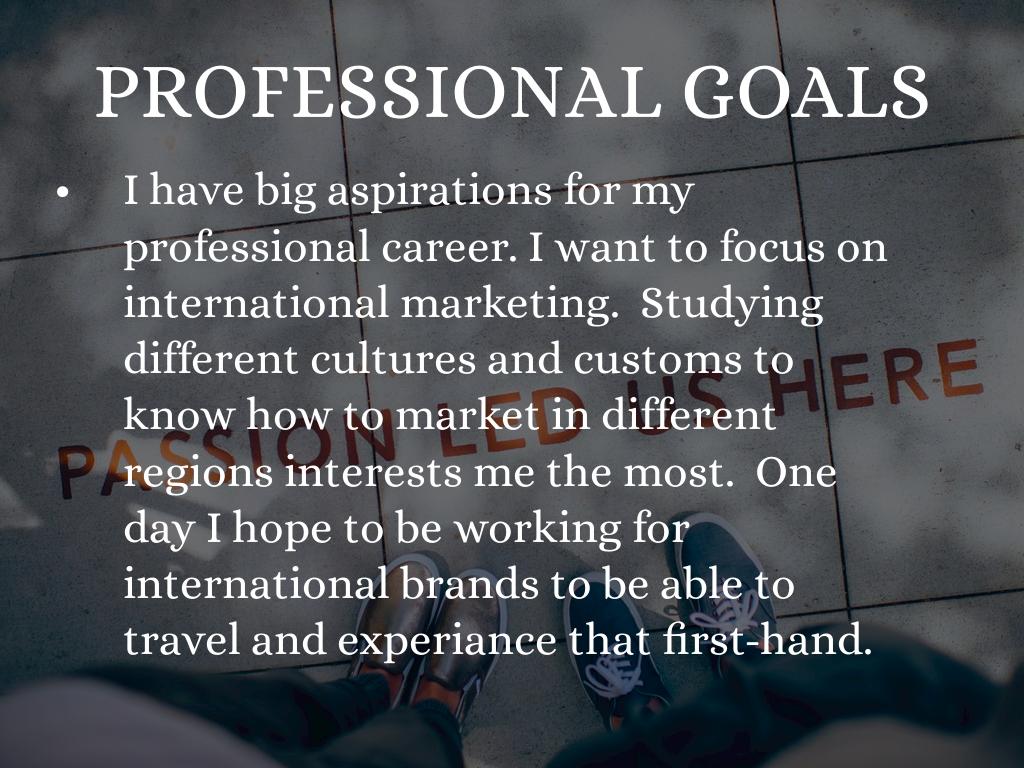 I have big aspirations for my professional career. I want to focus on international marketing. Studying different cultures and customs to know how to market in different regions interests me the most. One day I hope to be working for international brands to be able to travel and experiance that first-hand.