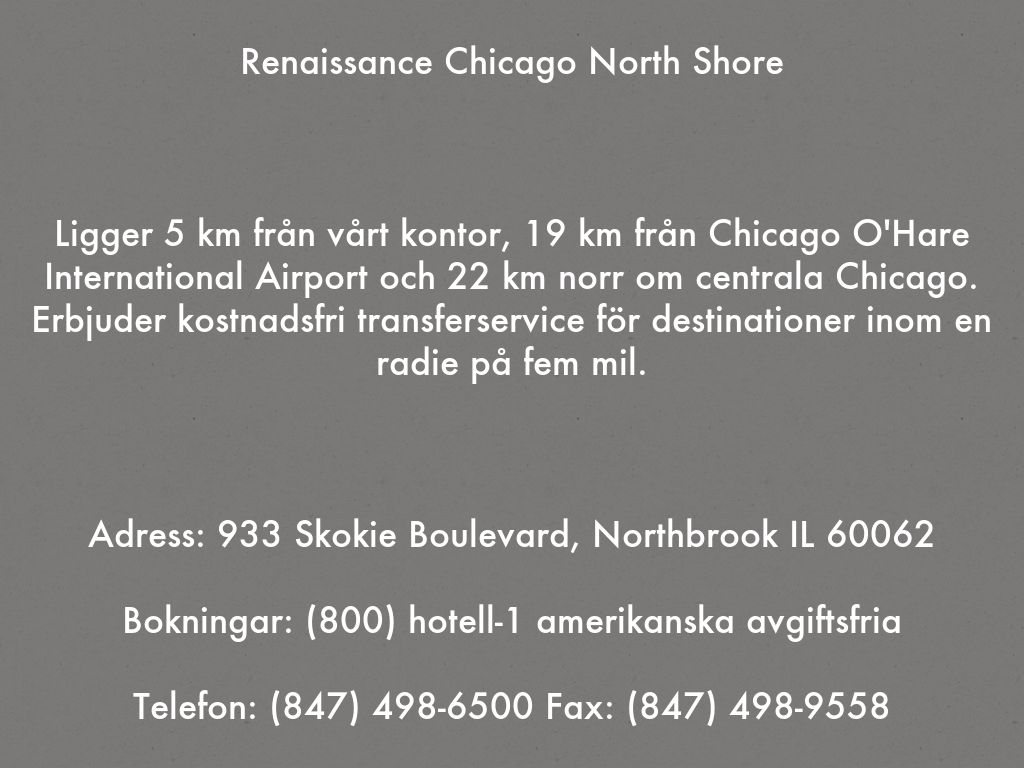 Ligger 5 km från vårt kontor, 19 km från Chicago O'Hare International Airport och 22 km norr om centrala Chicago. Erbjuder kostnadsfri transferservice för destinationer inom en radie på fem mil.