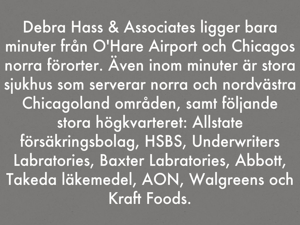 Debra Hass & Associates ligger bara minuter från O'Hare Airport och Chicagos norra förorter. Även inom minuter är stora sjukhus som serverar norra och nordvästra Chicagoland områden, samt följande stora högkvarteret: Allstate försäkringsbolag, HSBS, Underwriters Labratories, Baxter Labratories, Abbott, Takeda läkemedel, AON, Walgreens och Kraft Foods.