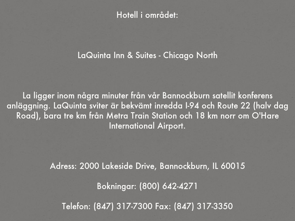 La ligger inom några minuter från vår Bannockburn satellit konferens anläggning. LaQuinta sviter är bekvämt inredda I-94 och Route 22 (halv dag Road), bara tre km från Metra Train Station och 18 km norr om O'Hare International Airport.