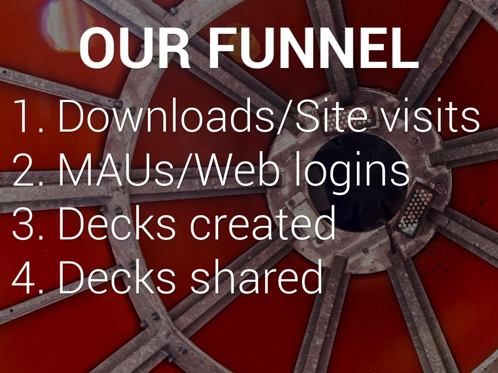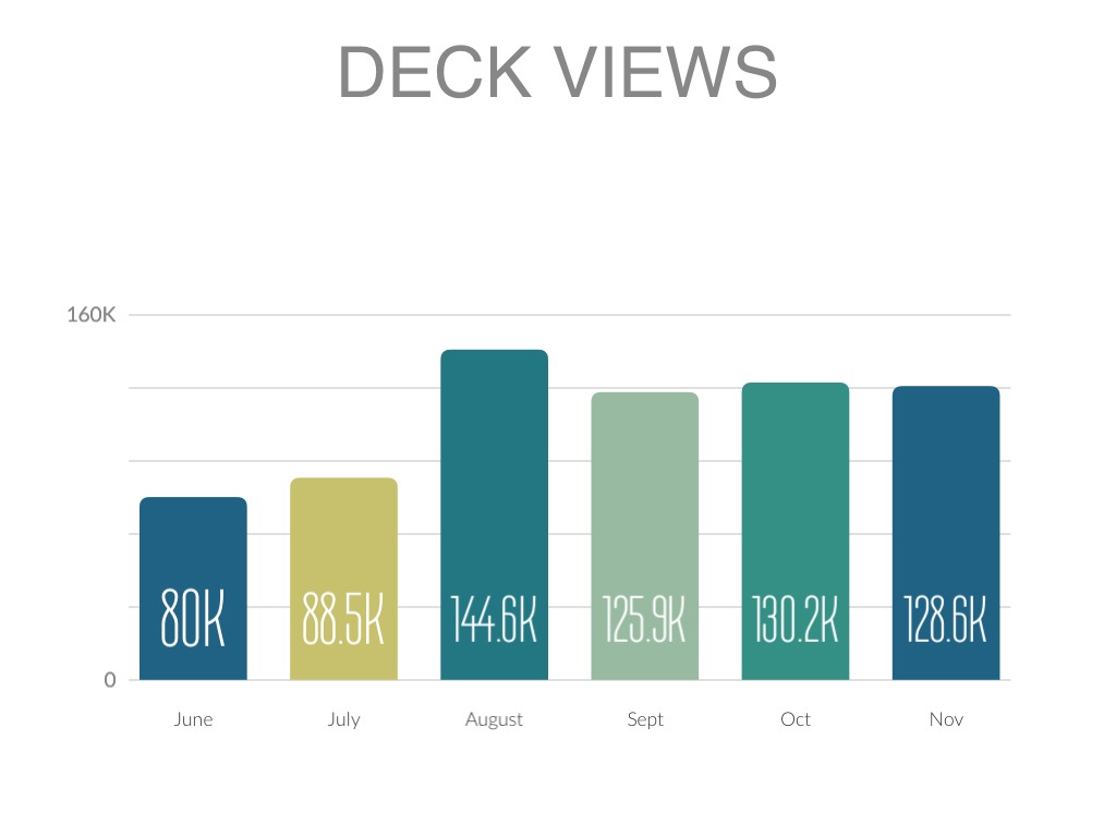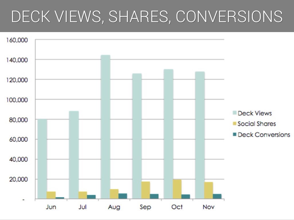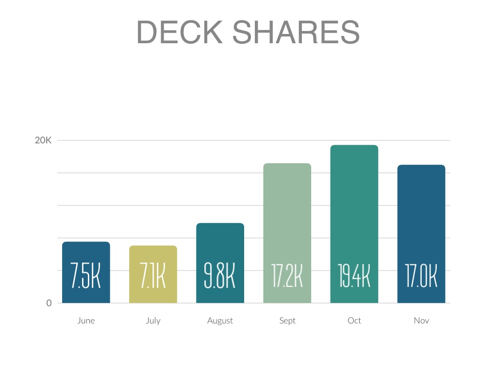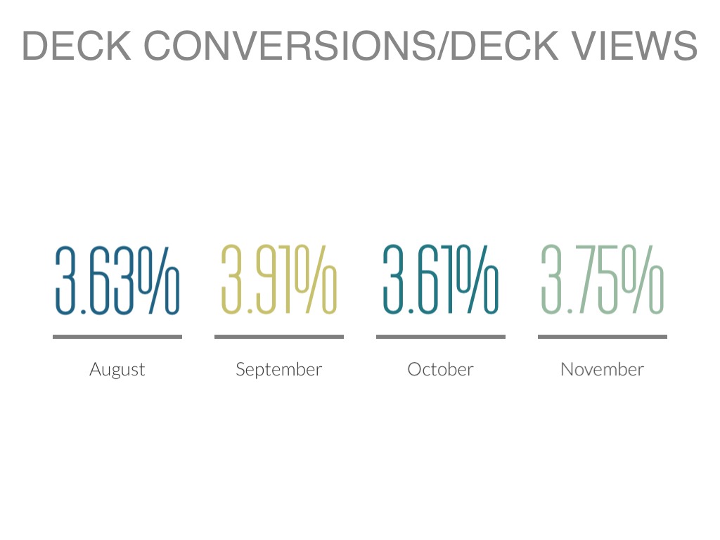Social shares have ore than doubled since June, and both deck views and conversions are up 1.5X. Still significant opportunity to convert more deck viewers to shares and new users.