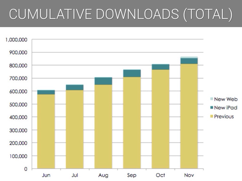 This is a new format showing more clearly the proportion of new iPad and Web downloads each month. The web portion is still tiny, but it tripled M-O-M from October to November.