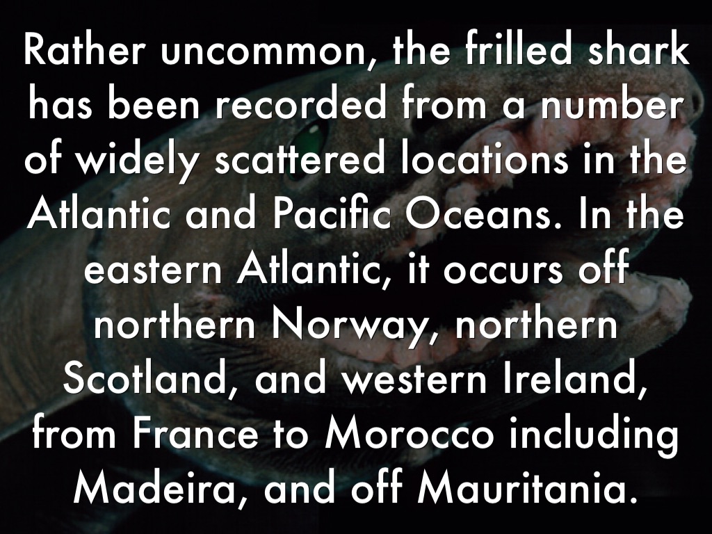 Rather uncommon, the frilled shark has been recorded from a number of widely scattered locations in the Atlantic and Pacific Oceans. In the eastern Atlantic, it occurs off northern Norway, northern Scotland, and western Ireland, from France to Morocco including Madeira, and off Mauritania.