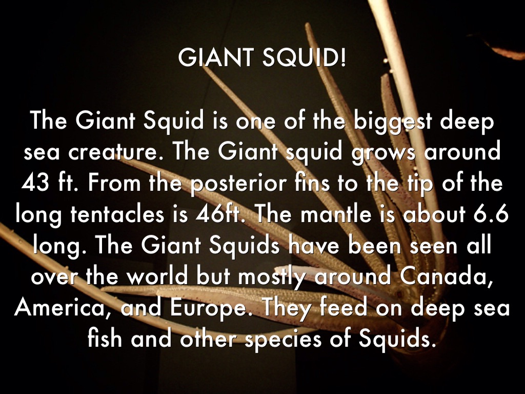 The Giant Squid is one of the biggest deep sea creature. The Giant squid grows around 43 ft. From the posterior fins to the tip of the long tentacles is 46ft. The mantle is about 6.6 long. The Giant Squids have been seen all over the world but mostly around Canada, America, and Europe. They feed on deep sea fish and other species of Squids.