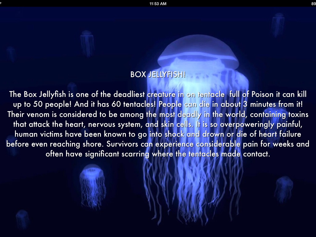 The Box Jellyfish is one of the deadliest creature in on tentacle full of Poison it can kill up to 50 people! And it has 60 tentacles! People can die in about 3 minutes from it!Their venom is considered to be among the most deadly in the world, containing toxins that attack the heart, nervous system, and skin cells. It is so overpoweringly painful, human victims have been known to go into shock and drown or die of heart failure before even reaching shore. Survivors can experience considerable pain for weeks and often have significant scarring where the tentacles made contact.
