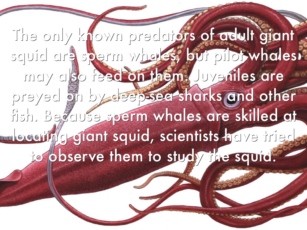 The only known predators of adult giant squid are sperm whales, but pilot whales may also feed on them. Juveniles are preyed on by deep-sea sharks and other fish. Because sperm whales are skilled at locating giant squid, scientists have tried to observe them to study the squid.