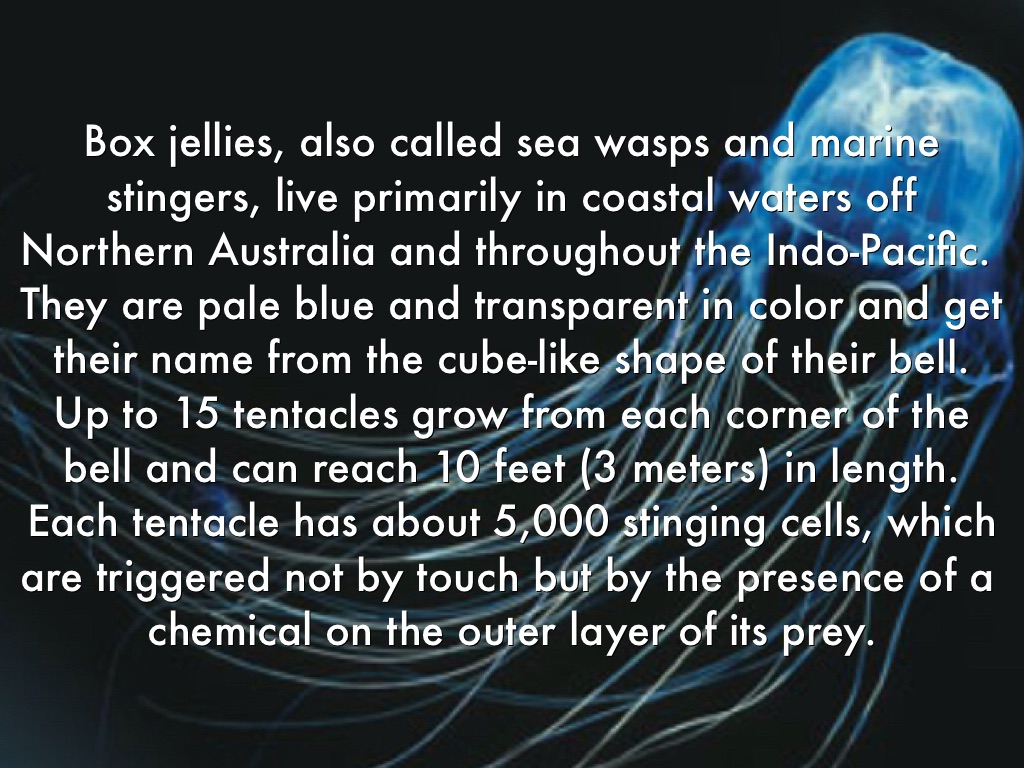 Box jellies, also called sea wasps and marine stingers, live primarily in coastal waters off Northern Australia and throughout the Indo-Pacific. They are pale blue and transparent in color and get their name from the cube-like shape of their bell. Up to 15 tentacles grow from each corner of the bell and can reach 10 feet (3 meters) in length. Each tentacle has about 5,000 stinging cells, which are triggered not by touch but by the presence of a chemical on the outer layer of its prey.