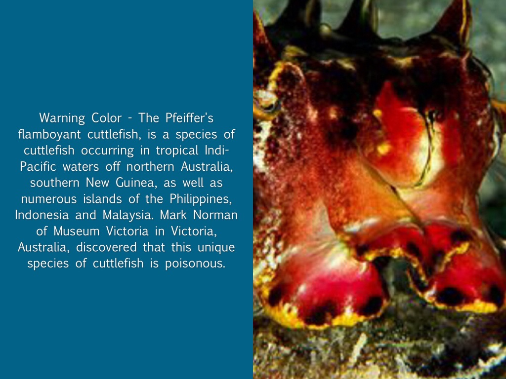 Warning Color - The Pfeiffer's flamboyant cuttlefish, is a species of cuttlefish occurring in tropical Indi-Pacific waters off northern Australia, southern New Guinea, as well as numerous islands of the Philippines, Indonesia and Malaysia. Mark Norman of Museum Victoria in Victoria, Australia, discovered that this unique species of cuttlefish is poisonous.