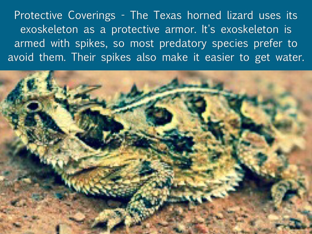 Protective Coverings - The Texas horned lizard uses its exoskeleton as a protective armor. It's exoskeleton is armed with spikes, so most predatory species prefer to avoid them. Their spikes also make it easier to get water.
