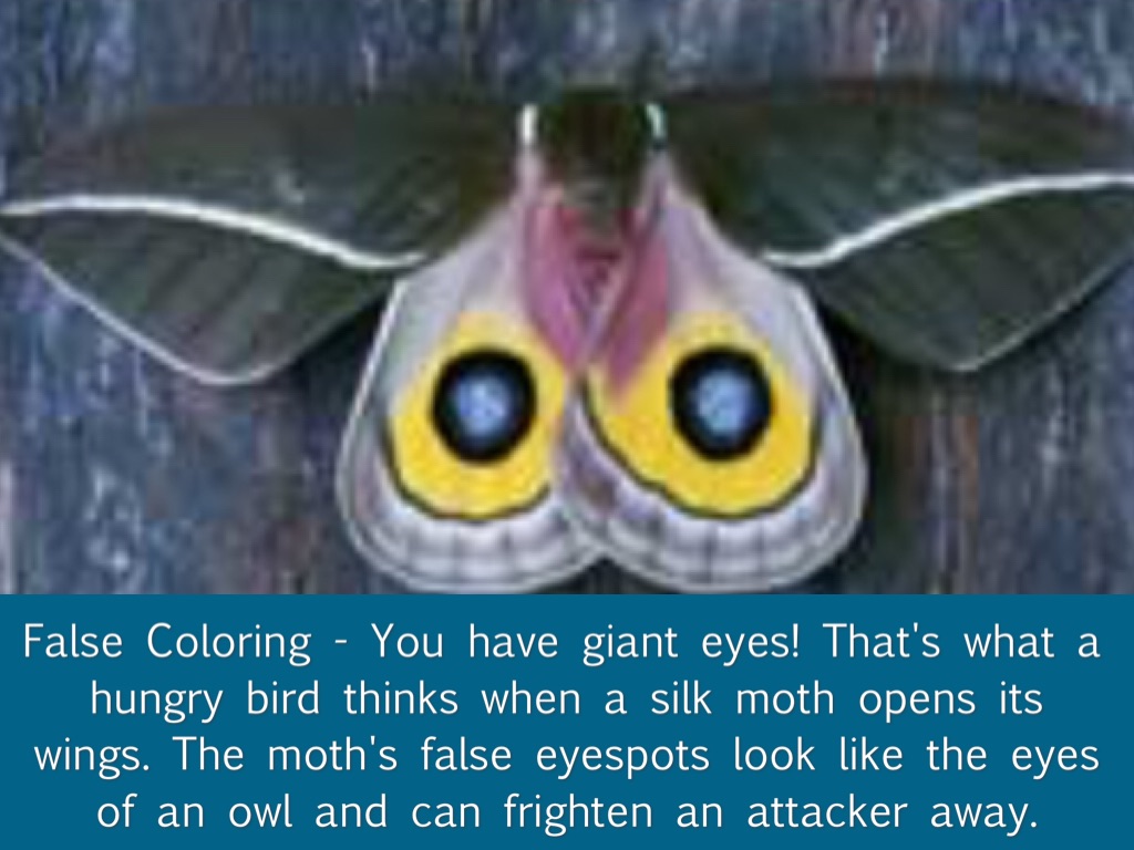 False Coloring - You have giant eyes! That's what a hungry bird thinks when a silk moth opens its wings. The moth's false eyespots look like the eyes of an owl and can frighten an attacker away.