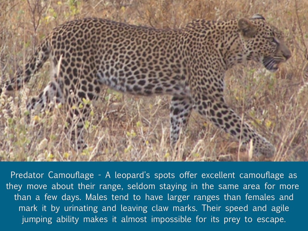 Predator Camouflage - A leopard's spots offer excellent camouflage as they move about their range, seldom staying in the same area for more than a few days. Males tend to have larger ranges than females and mark it by urinating and leaving claw marks. Their speed and agile jumping ability makes it almost impossible for its prey to escape.