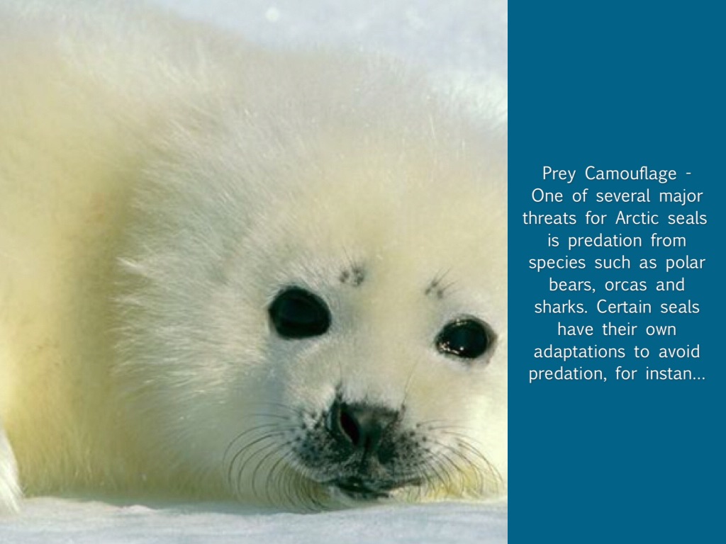 Prey Camouflage - One of several major threats for Arctic seals is predation from species such as polar bears, orcas and sharks. Certain seals have their own adaptations to avoid predation, for instance baby harp seals have white coats to blend in with the snow.