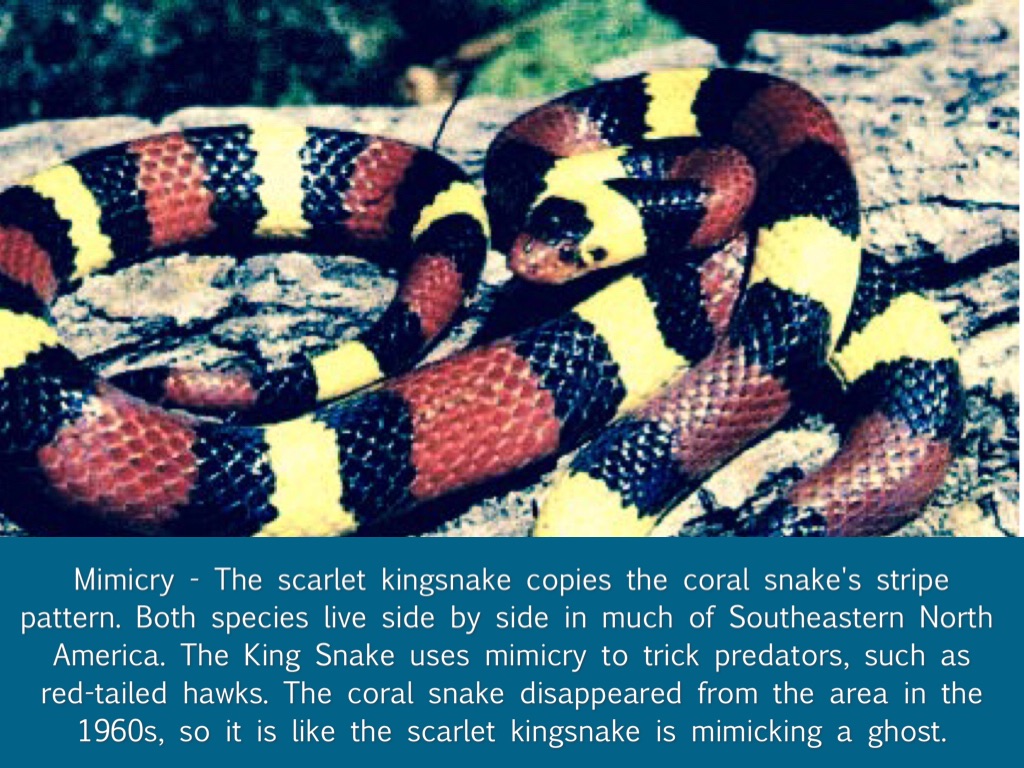 Mimicry - The scarlet kingsnake copies the coral snake's stripe pattern. Both species live side by side in much of Southeastern North America. The King Snake uses mimicry to trick predators, such as red-tailed hawks. The coral snake disappeared from the area in the 1960s, so it is like the scarlet kingsnake is mimicking a ghost.