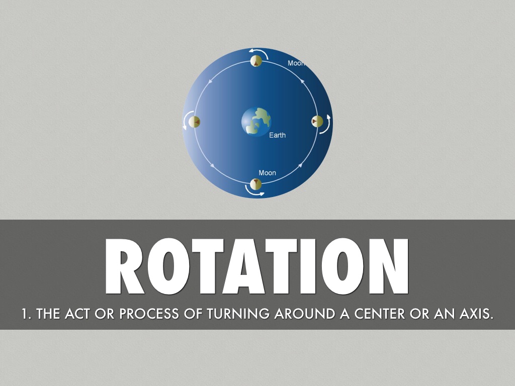 1. THE ACT OR PROCESS OF TURNING AROUND A CENTER OR AN AXIS.
