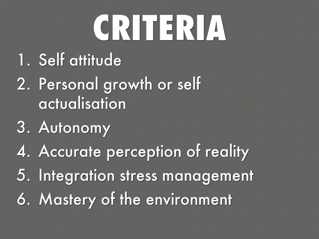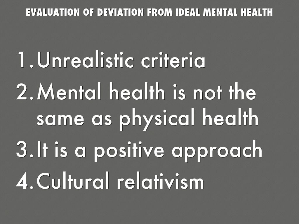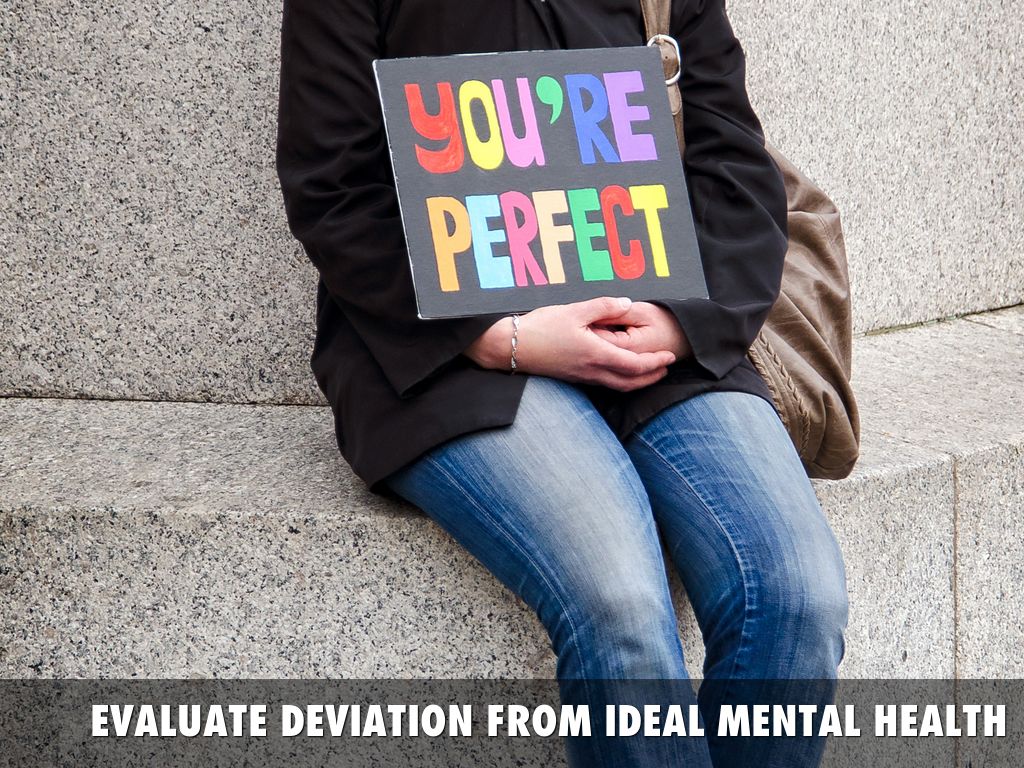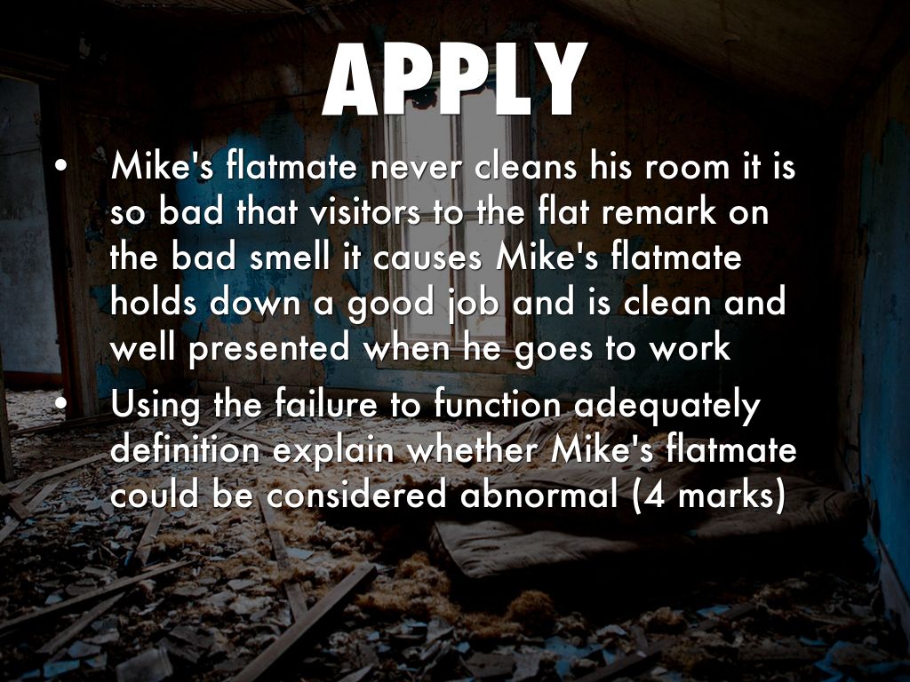 V___________ of ______ S_____ V_____________and _____________ FAILURE TO FUNCTION ADEQUATELY Failing to cope with every day living It may cause distress for the individual and or others around them It must affect the individual not just the others EVALUATE FAILURE TO FUNCTION ADEQUATELY EVALUATION OF FAILURE TO FUNCTION Who judges The behaviour may be functional Easy to measure objectively DEFINE DEVIATION FROM IDEAL MENTAL HEALTH CRITERIA Self attitude Personal growth or self actualisation Autonomy Accurate perception of reality Integration stress management Mastery of the environment EVALUATE DEVIATION FROM IDEAL MENTAL HEALTH EVALUATION OF DEVIATION FROM IDEAL MENTAL HEALTH Unrealistic criteria Mental health is not the same as physical health It is a positive approach Cultural relativism APPLY Pete spends up to 60 hours every week video-gaming his parents complain that this is so extreme that he must be addicted. Using statistical infrequency explain whether Pete's behaviour could be considered abnormal (4) APPLY Mike's flatmate never cleans his room it is so bad that visitors to the flat remark on the bad smell it causes Mike's flatmate holds down a good job and is clean and well presented when he goes to work Using the failure to function adequately definition explain whether Mike's flatmate could be considered abnormal (4 marks) Haiku Deck Pro User