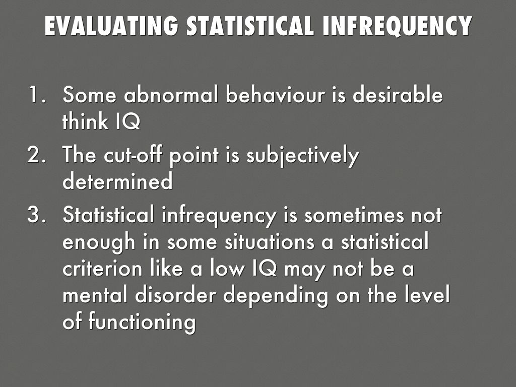 PRESENTATION OUTLINEDEFINE STATISTICAL INFREQUENCY 3 MARK DEFINITION Refers to conditions that are rare compared to the norm. Many human characteristics fall into normal frequency distributions. This can tell us what is common or normal what is uncommon or abnormal. Eg facing every day challenges - rare to be excessively fearless or excessively fearful and normal to experience some anxiety EVALUATE STATISTICAL INFREQUENCY EVALUATING STATISTICAL INFREQUENCY Some abnormal behaviour is desirable think IQ The cut-off point is subjectively determined Statistical infrequency is sometimes not enough in some situations a statistical criterion like a low IQ may not be a mental disorder depending on the level of functioning DEFINE DEVIATION FROM SOCIAL NORMS THREE MARKS WORTH Social norms created by social groups of people about what comprises acceptable standards of behaviour Deviation from social norms is classed as abnormal Some rules are implicit whereas others are policed by laws An example would be laughing at a funeral EVALUATE DEVIATION FROM SOCIAL NORMS EVALUATION OF DEVIATION FROM SOCIAL NORMS The deviance is related to context and degree There is the risk of abuse Cultural relativism DEFINE FAILURE TO FUNCTION ADEQUATELY Can you name all 7 Unp___________