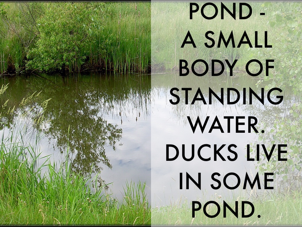 A SMALL BODY OF STANDING WATER. DUCKS LIVE IN SOME POND.