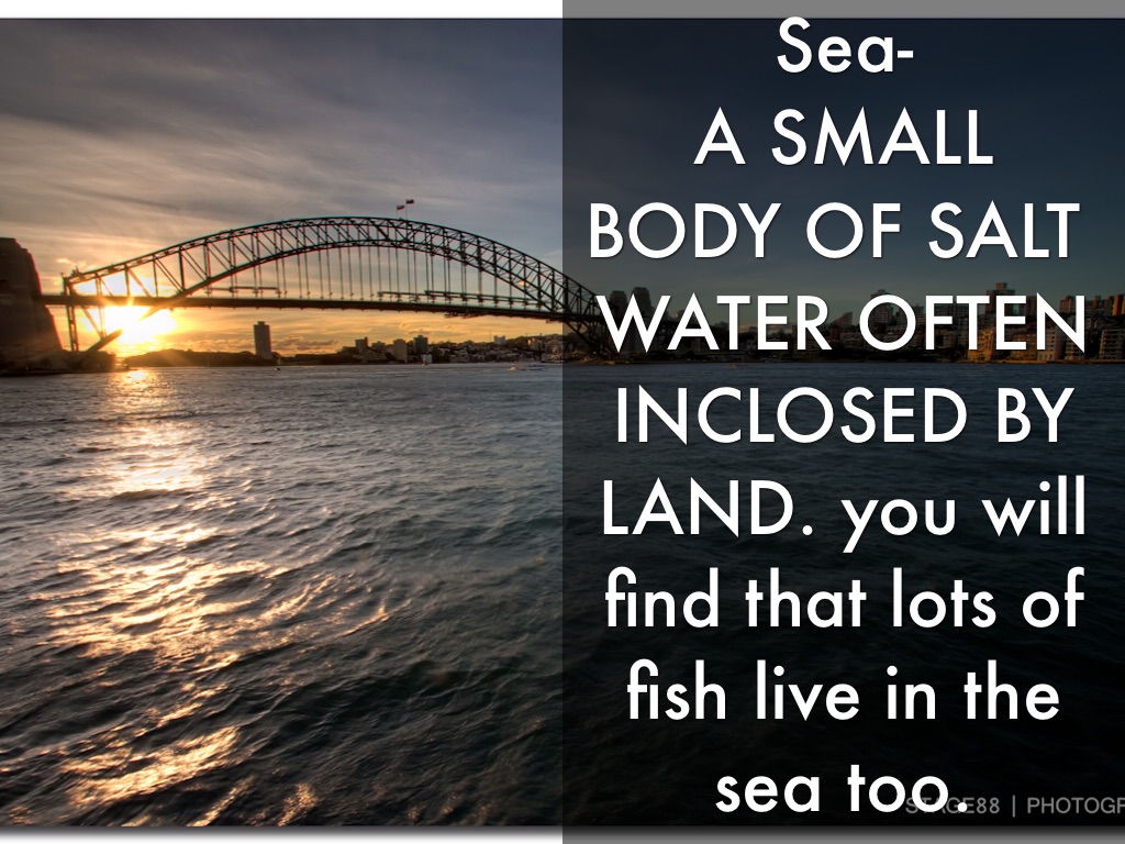 A SMALL BODY OF SALT WATER OFTEN INCLOSED BY LAND. you will find that lots of fish live in the sea too.