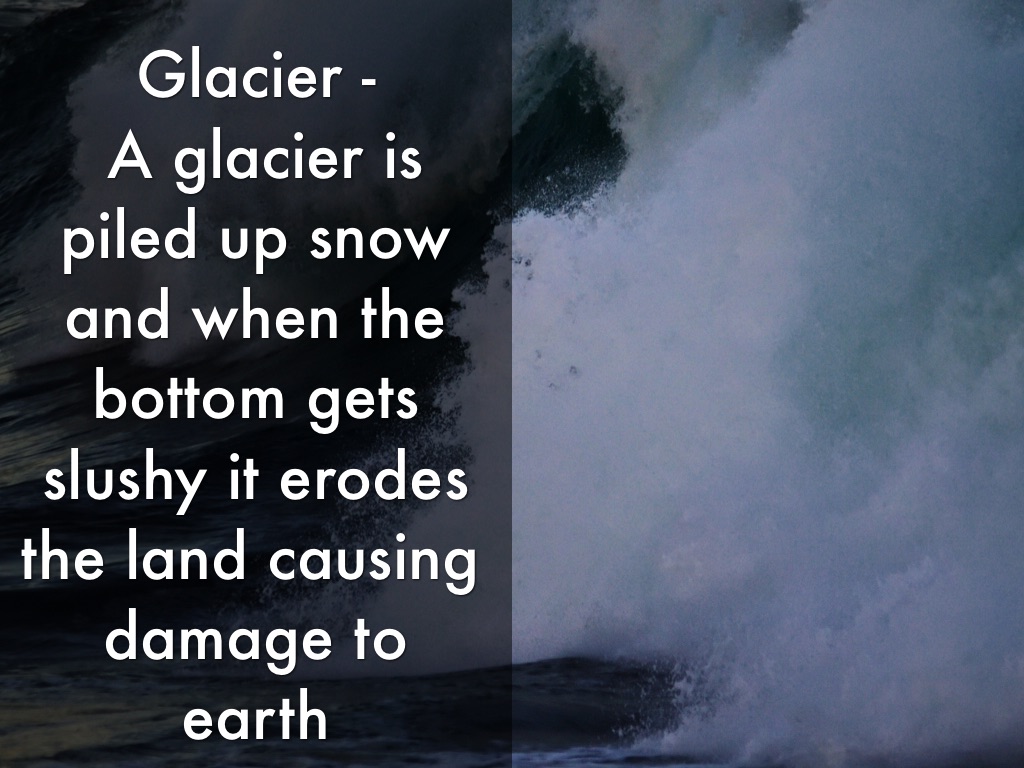 A glacier is piled up snow and when the bottom gets slushy it erodes the land causing damage to earth