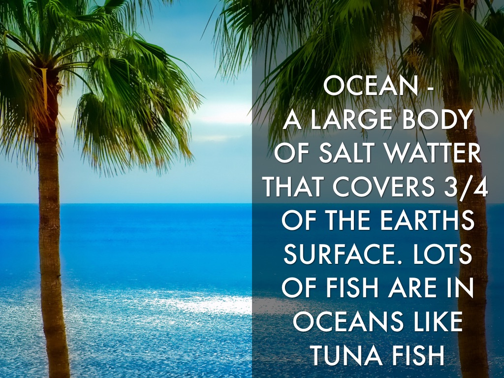 A LARGE BODY OF SALT WATTER THAT COVERS 3/4 OF THE EARTHS SURFACE. LOTS OF FISH ARE IN OCEANS LIKE TUNA FISH